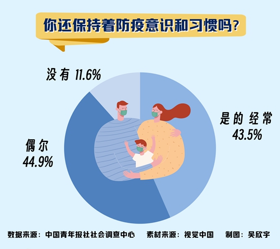 调查中,88.4%的受访者还保持着防疫意识和习惯,其中,44.9%的受访者表示“偶尔”会保持,43.5%的受访者“经常”保持着防疫意识和习惯,11.6%的受访者表示没有再继续保持防疫意识和习惯了。