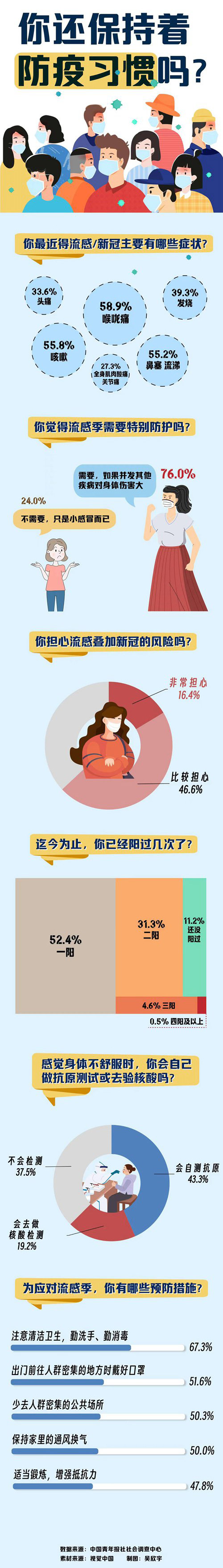近日,中国青年报社社会调查中心联合问卷网(wenjuan.com),对1000名受访者进行的一项调查显示,88.4%的受访者目前还保持着防疫意识和习惯,76.0%的受访者觉得流感季需要特别防护,为应对流感季,67.3%的受访者会注意清洁卫生,勤洗手、勤消毒。