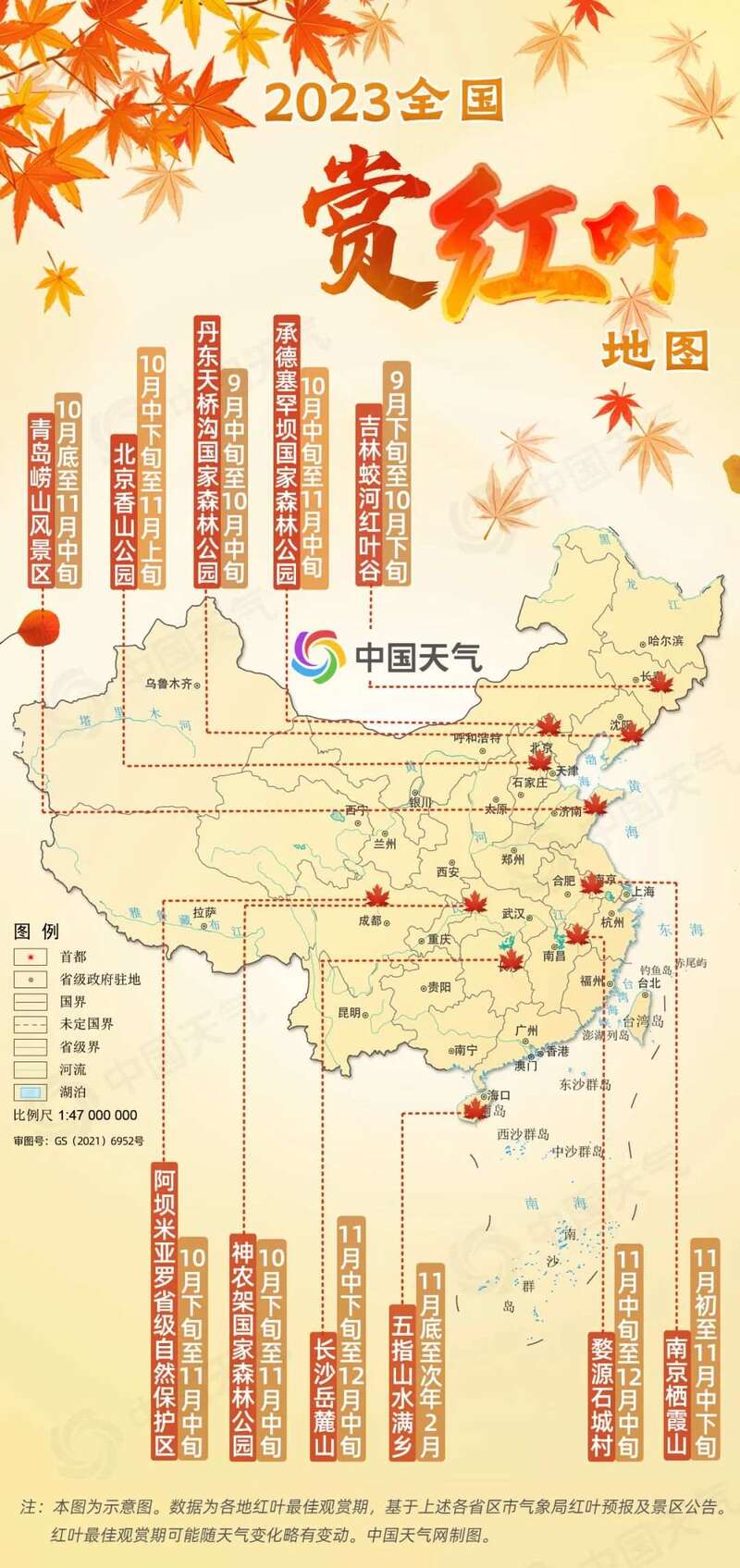 红叶是众多秋色中最耀眼的一道风景,观赏红叶也是古往今来人们秋季出游的保留项目。今年秋天这抹热烈的红,你想和谁一起分享?中国天气网友情提醒,红叶最佳观赏期较短,而且容易受天气影响出现波动,小伙伴们要及时关注气象部门及景区发布的相关服务信息,合理规划出游时间。