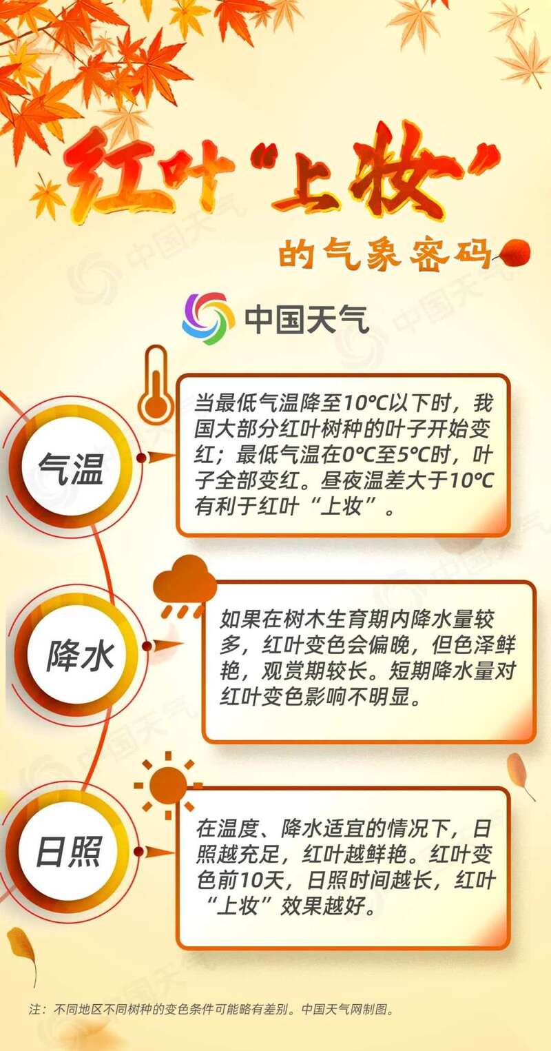 “气温、降水和日照,都会直接影响红叶‘上妆’的进程和效果。”中国天气网气象分析师王伟跃表示,一般来讲,当最低气温降至10℃以下时,我国大部分红叶树种的叶子就会开始变红;最低气温在0℃至5℃时,叶子会全部变红。此外,昼夜温差大于10℃也有利于红叶“上妆”。