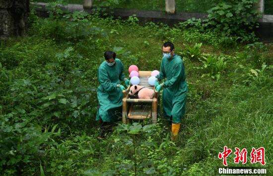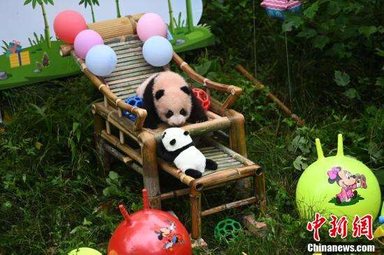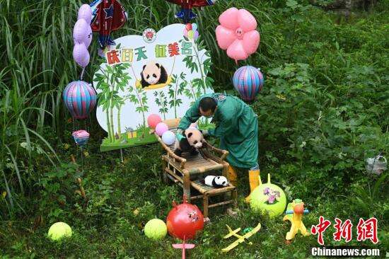 中新网记者 陈超 摄 工作人员用椅子抬着大熊猫宝宝与游客见面。