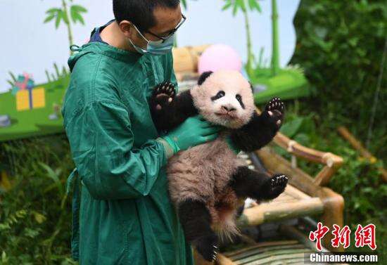 中新网记者 陈超 摄 据介绍,7月6日,大熊猫“莽仔”顺利产下这只雄性宝宝,宝宝初生体重191g,是在重庆动物园出生的最重的大熊猫个体。图为工作人员抱着大熊猫宝宝与游客见面。