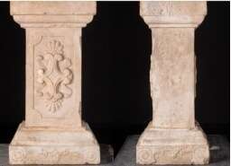 圆明园西洋楼建筑以木质梁柱为基础,通过用砖砌筑内墙,外部包以汉白玉等石材的方法建造。其建筑主体仿西方巴洛克风格建造,常在建筑上设立石柱作为望柱或栏杆连接物使用,同时还具有装饰的作用。两侧没有雕花的石柱应为建筑上的联排装饰物,两侧饰有花瓶或花纹的石柱则用于楼梯或楼层平台栏杆部分,花瓶的样式则是配合栏杆形制雕刻而成。此次回归的石柱共7件,均为汉白玉材质,通高约80—92cm,立面有雕花造型,品相较好,推测均来自西洋楼遗址区。这些石柱正面纹饰以西式番花、贝壳纹等西洋雕花为主,侧面花瓶内花束则以具有吉祥寓意的牡丹、玉兰、荷花、菊花等中国传统花卉为主,圭角卷云纹、开窗的海棠线雕刻方式等亦与中国古建望柱、栏板相同,体现了中西合璧的文化内涵。