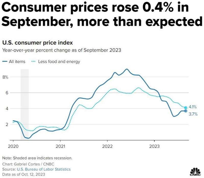 美国劳工统计局10月12日公布的数据显示,9月美国消费者价格指数(CPI)环比增长0.4%,同比增长3.7%。当月,剔除波动较大的食品和能源价格后,核心CPI环比增长0.3%,同比增长4.1%。
