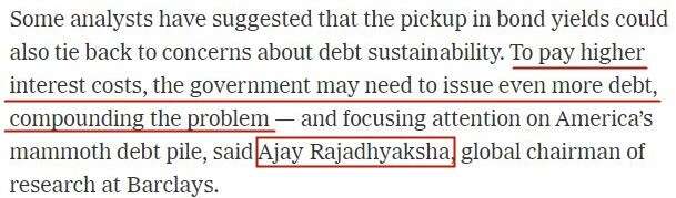 巴克莱全球研究部主席拉贾迪亚克沙表示,为了支付更高的利息成本,政府可能需要发行更多债券,从而使问题更加复杂。
