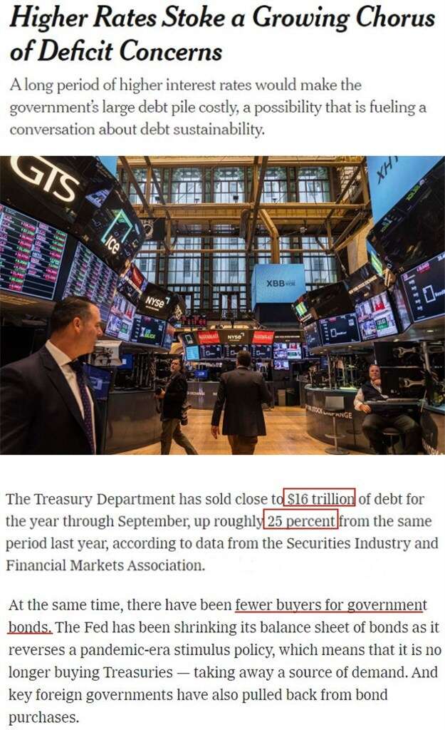 美国证券业和金融市场协会的数据显示,截至今年9月的一年时间里,美财政部已售出近16万亿美元债券,较上一个年同期增长约25%。