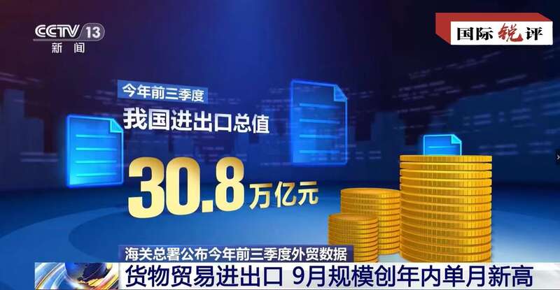 事实上,今年前三季度,面对复杂严峻的外部环境和国内多重困难挑战,中国外贸保持平稳运行、积极向好。中国官方13日发布的数据显示,前三季度中国进出口总值达30.8万亿元人民币,同比增速基本持平。分季度看,一、二、三季度进出口分别为9.72万亿、10.29万亿、10.79万亿元,外贸规模逐季抬升。其中,9月进出口规模创年内单月新高。有关专家对《国际锐评》表示,近月中国外贸边际改善的迹象非常明显,贸易结构也有所优化。