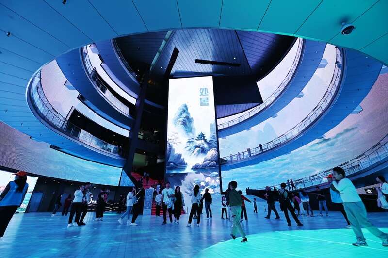 中央圆厅的冬奥遗产展示体验厅,大屏约250平方米,地屏约700平方米,结合1800多平方米的环形屏幕,构成了一个如梦如幻的光影世界。中国电影博物馆专门制作了二十四节气、中国传统节日、特色电影等主题视觉,让观众沉浸式地感受光影互动带来的乐趣。
