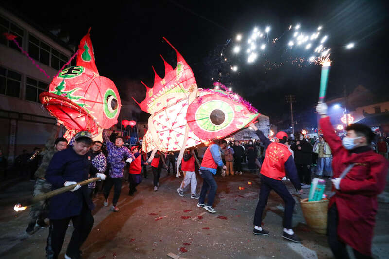 2月3日,在安徽省黄山市歙县溪头镇汪满田村,人们嬉鱼灯。新华社发(樊成柱 摄)