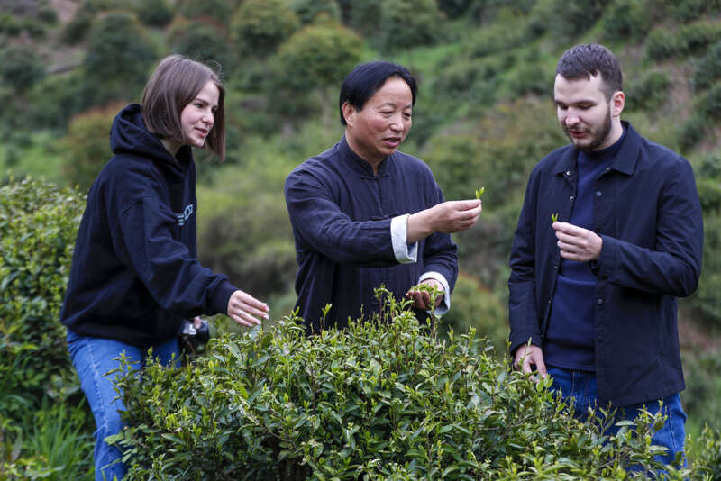 3月29日,在安徽省黄山市祁门县,祁门红茶制作技艺代表性传承人王昶(中)向外国客商介绍祁门红茶。新华社发(施亚磊 摄)