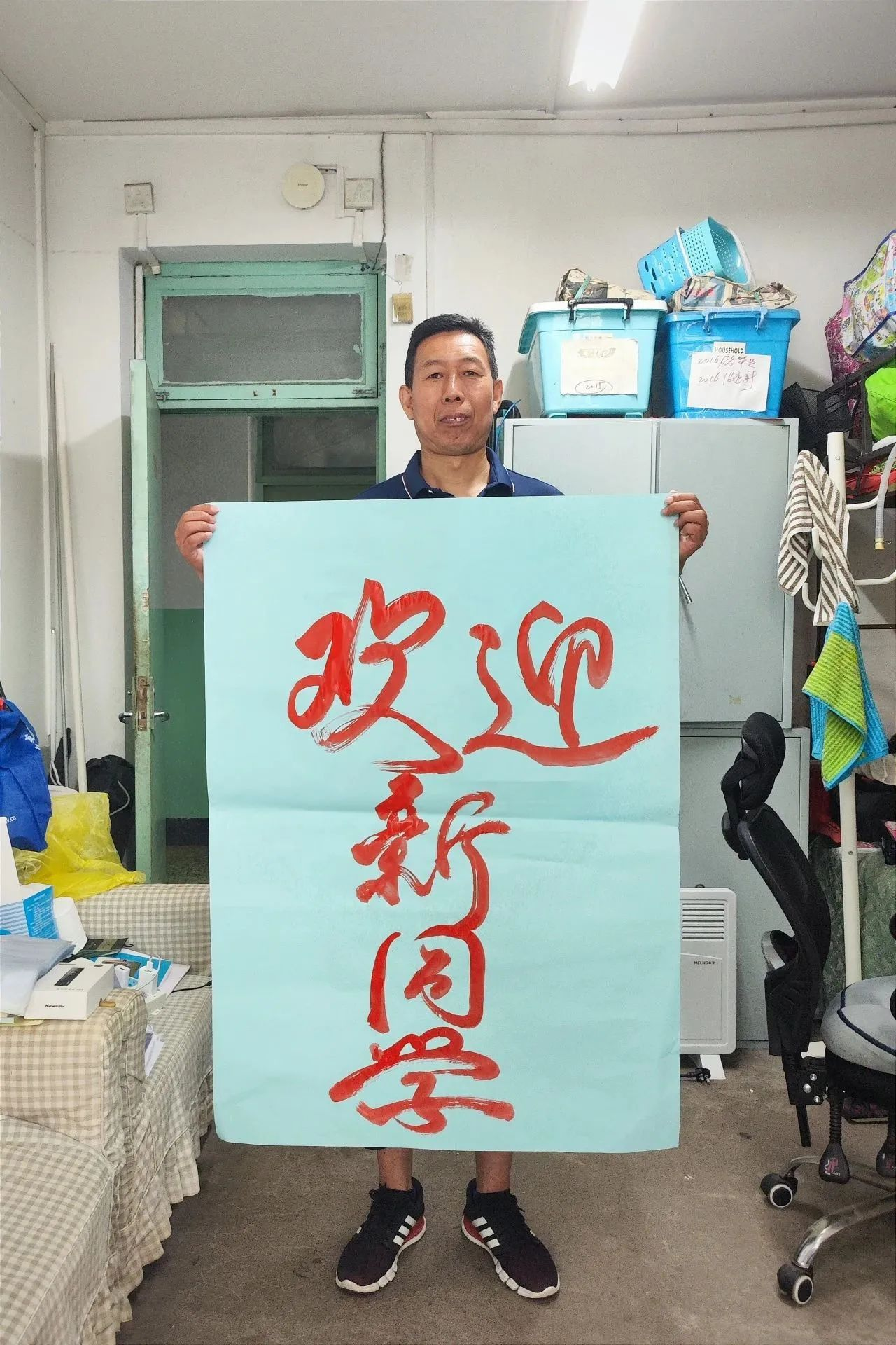 打扫宿舍内外环境,检查宿舍安全,男生宿舍管理员王中县在繁忙工作之余,喜欢用书法和同学们交流。“每年不变的两个主题‘欢迎新同学’‘欢送毕业生’!” 王中县说他的“书法”主题围绕学生入校和离校两个重要节点展开。今年暑假,忙碌准备好男生宿舍的各项准备工作后,他在朋友圈写下“永恒的主题~欢迎新同学;这里一切准备就绪,期待你们的加入!愿你们都能怀揣梦想,脚踏实地,奋发有为,都能实现自己的理想,成为最好的自己!”
