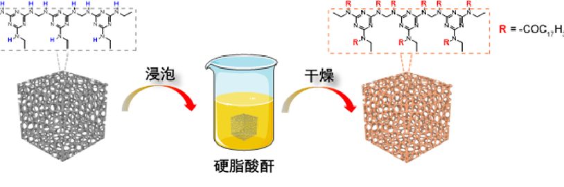 在任长亮的启发下,他们打算在家庭厨房中常见的“清洁海绵”上做文章。三聚氰胺海绵(MS)是家庭厨房中常见的清洁材料,成本低,既能吸水,也能吸油。如果通过某种方法,使海绵表面形成只吸收油而不吸收水的超疏水表面,那这样的海绵或许就可以在海中只吸收石油而不吸收海水,从而达到清理海上溢油的目的。