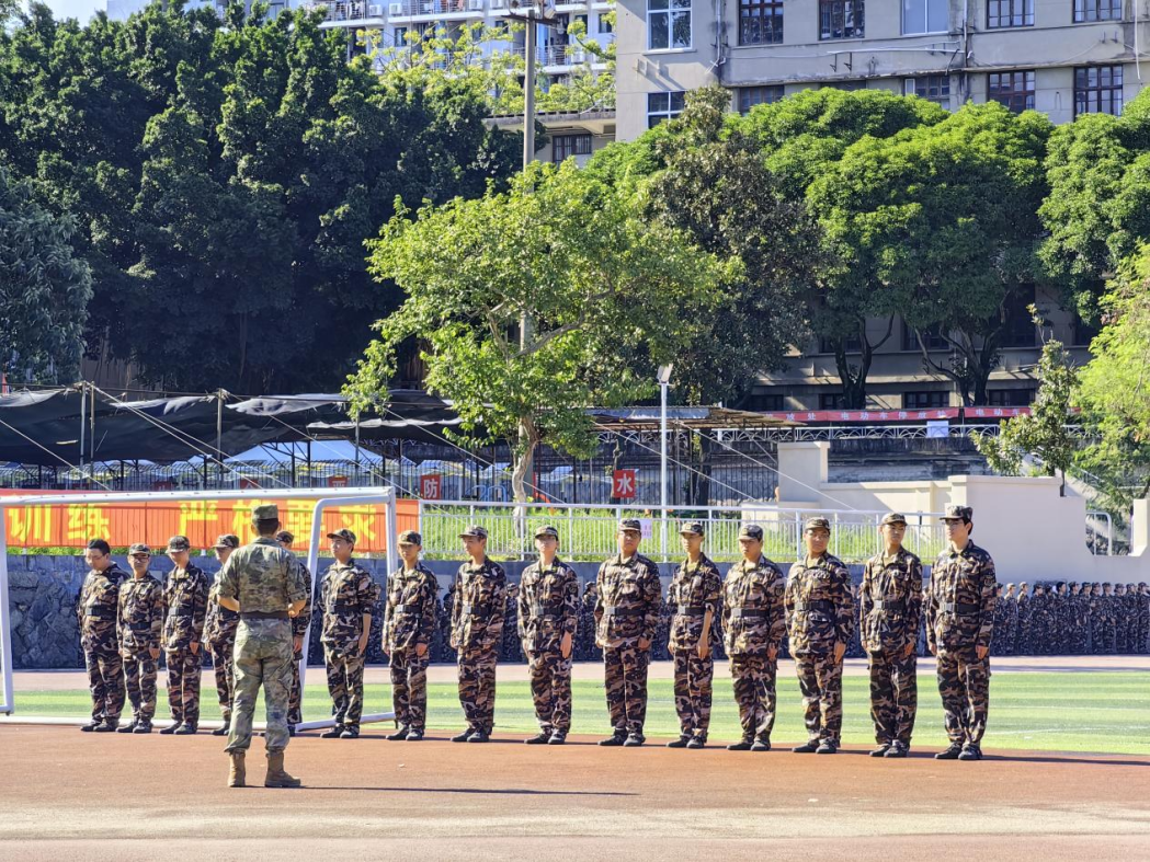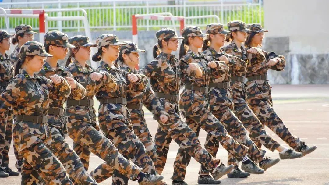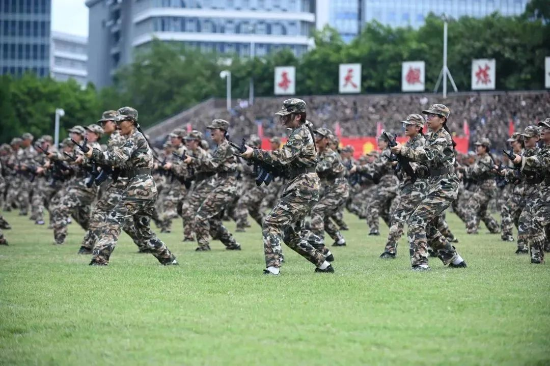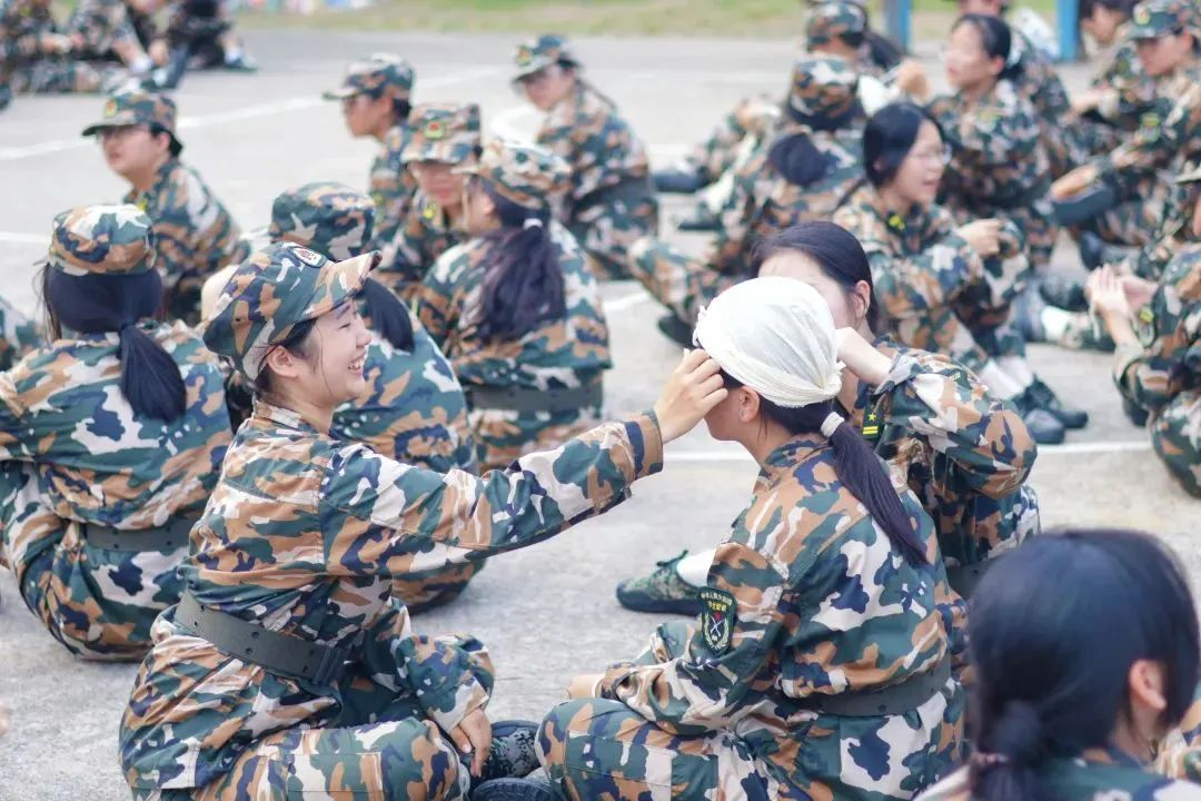 迷彩方阵列队整齐划一,步履疾疾踏出隆隆声响。23级新生们正身着墨绿迷彩,顶着烈日,训练着属于他们方阵的一招一式。拿着金属制的95式自动步枪,猛地向前一刺,练习刺杀操;包扎、固定、搬运,学习战伤救护;整排同频摆手、抬脚,齐齐前行,一同走正步。