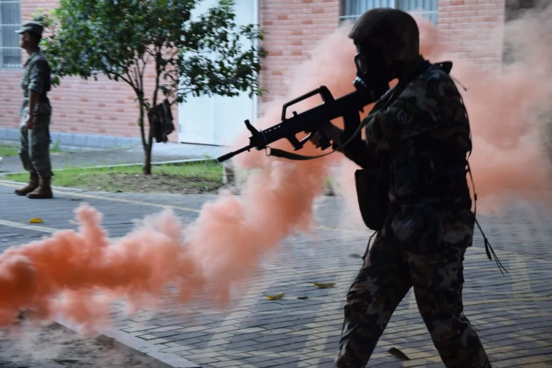 拉练长队经过“毒气区”时,彩色的迷烟逐渐弥漫,降低了可视度,即将包裹住前排的同学。捂住口鼻,不能闻!教官一声令下,全体新生迅速穿过沾染地带。这个场景带给新生们训练的真实感,弥漫而来的紧迫与危机感不断刺激着他们的神经。