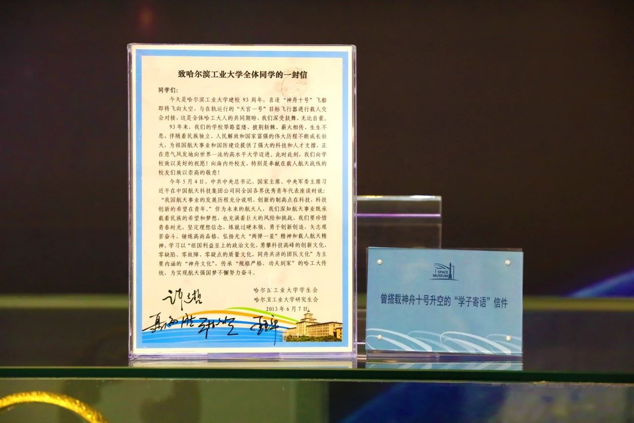 “学子寄语”信件是哈工大学生会、哈工大研究生会向全校学子发出的倡议信,信上有许达哲校友和航天员聂海胜、张晓光、王亚平的亲笔签名。