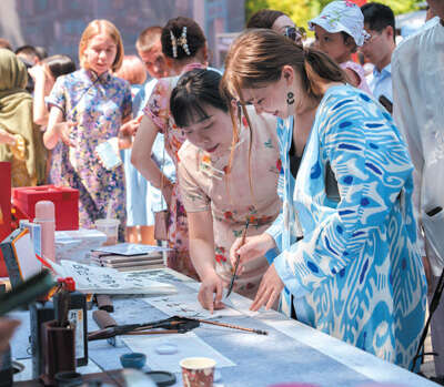5月,“茶和天下·雅集”活动在乌兹别克斯坦首都塔什干举行,当地市民在活动现场通过书法、剪纸和工艺品展示等领略丰富多彩的中国文化。