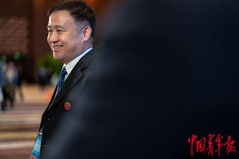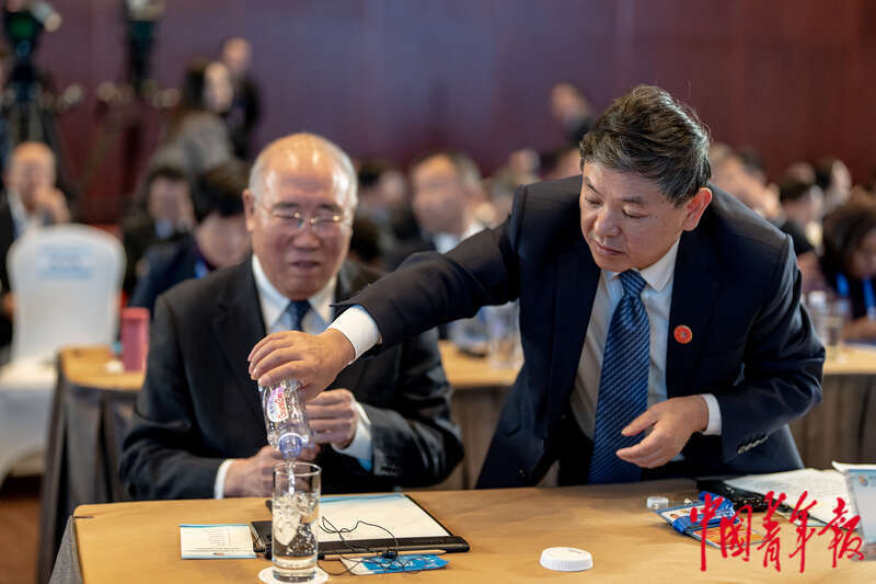 10月18日下午,北京国家会议中心,第三届“一带一路”国际合作高峰论坛绿色发展高级别论坛上,生态环境部部长黄润秋为中国气候变化事务特使解振华添水。中青报·中青网记者 李隽辉/摄