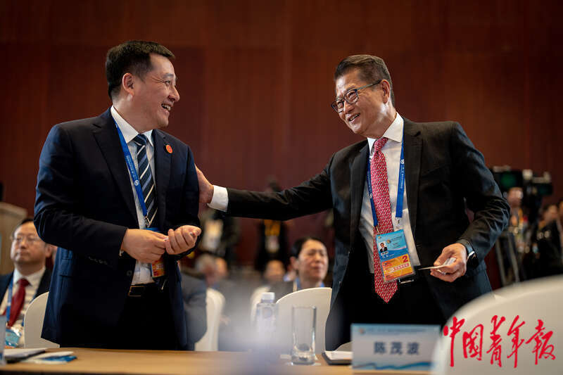 10月18日下午,北京国家会议中心,第三届“一带一路”国际合作高峰论坛绿色发展高级别论坛上,香港特区政府财政司司长陈茂波(右一)和昆明市委书记刘洪建交流。中青报·中青网记者 李隽辉/摄