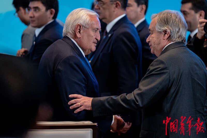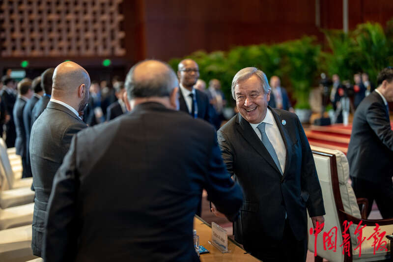 10月18日下午,北京国家会议中心,第三届“一带一路”国际合作高峰论坛绿色发展高级别论坛上,联合国秘书长古特雷斯和中国气候变化事务特使解振华握手。中青报·中青网记者 李隽辉/摄