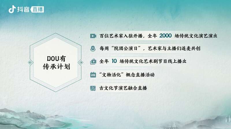 “DOU有传承”计划负责人石敏介绍,本次计划包括5个合作方向。首先,中国煤矿文工团百位艺术家将入驻开播;第二,抖音直播每周将为中国煤矿文工团打造“院团公演日”活动,文工团艺术家将与抖音传统文化主播跨界合作;第三,未来一年,中国煤矿文工团将选取10场经典剧节目播出;第四,双方将围绕文工团剧目中的“文物”“古籍”概念开展合作,发起主题直播;最后,双方将在线下推进合作,如选择历史文化底蕴深厚的城市,开展演艺融合直播。
