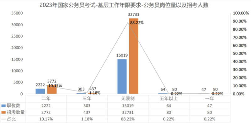 2024年国考招录依然坚持以基层为导向,面向基层岗位的招录人数占总人数的67.29%。在2024年国家公务员考试公告明确表明,“有近2.7万个计划补充到县(区)级及以下直属机构,根据实际对艰苦边远地区基层职位的学历、专业、工作年限和经历等报考条件进行适当调整,进一步充实基层公务员队伍。设置3000余个计划定向招录服务基层项目人员和在军队服役5年以上的高校毕业生退役士兵,鼓励引导人才向基层一线流动、积极投身国防事业。”