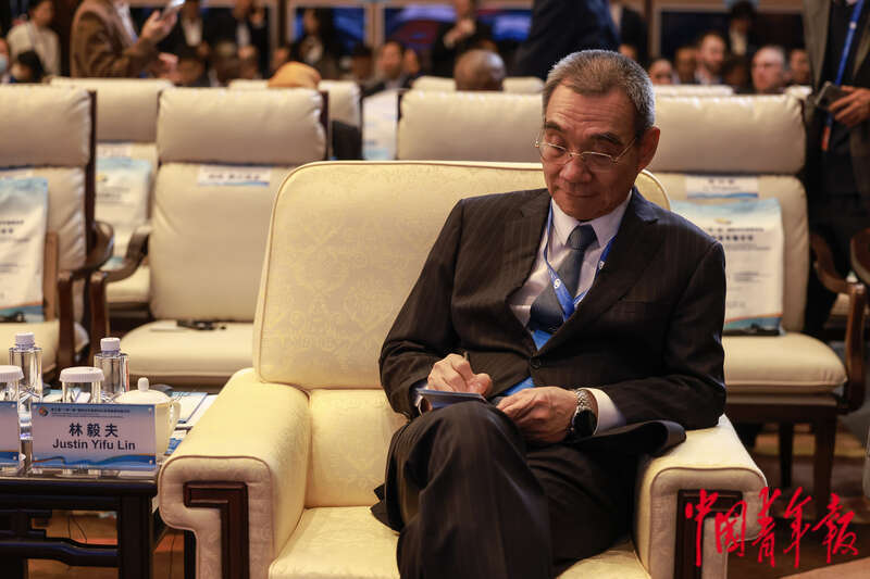 10月18日,北京国家会议中心,第三届“一带一路”国际合作高峰论坛贸易畅通专题论坛上,世界银行原副行长、北京大学新结构经济学研究院院长林毅夫在做笔记。中青报·中青网记者 曲俊燕/摄