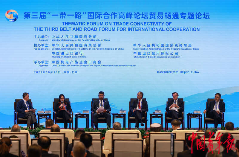 10月18日,北京国家会议中心,第三届“一带一路”国际合作高峰论坛贸易畅通专题论坛,(左至右)中国中化控股有限责任公司原董事长、APEC工商咨询理事会可持续增长工作组主席宁高宁,阿尔及利亚税务总局局长阿梅尔·阿卜德拉提弗,吉尔吉斯共和国财政部下属海关署署长伊萨别科夫·萨马特 ·萨塔罗维奇,中国香港金融管理局总裁余伟文,渣打集团主席韦浩思,中远海运集团副总经理林戟,就维护产业链、供应链稳定畅通进行主题研讨。中青报·中青网记者 曲俊燕/摄