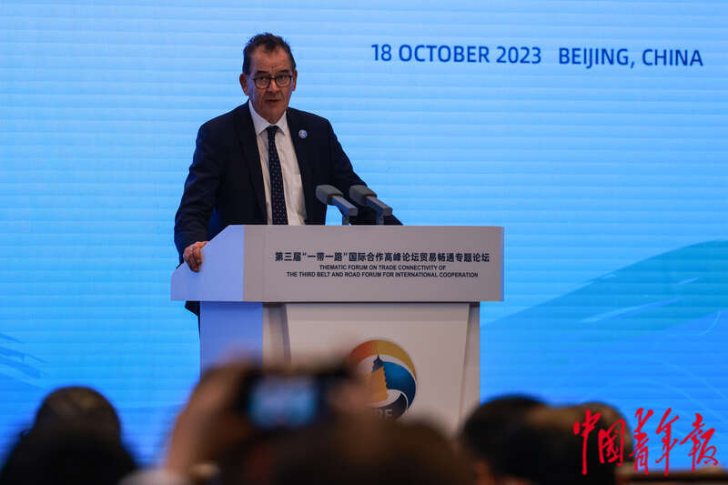 10月18日,北京国家会议中心,第三届“一带一路”国际合作高峰论坛贸易畅通专题论坛上,联合国工业发展组织总干事格尔德·穆勒致辞。中青报·中青网记者 曲俊燕/摄