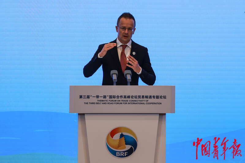 10月18日,北京国家会议中心,第三届“一带一路”国际合作高峰论坛贸易畅通专题论坛上,匈牙利外交与对外经济部部长西雅尔多·彼得致辞。中青报·中青网记者 曲俊燕/摄