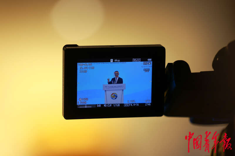 10月18日,北京国家会议中心,第三届“一带一路”国际合作高峰论坛贸易畅通专题论坛上,摄像机屏幕上显示世界银行原副行长、北京大学新结构经济学研究院院长林毅夫发言的画面。中青报·中青网记者 曲俊燕/摄