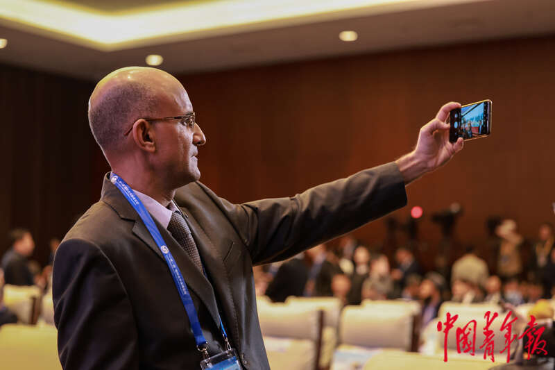 10月18日,北京国家会议中心,第三届“一带一路”国际合作高峰论坛贸易畅通专题论坛开始前,一名参会嘉宾自拍留念。中青报·中青网记者 曲俊燕/摄