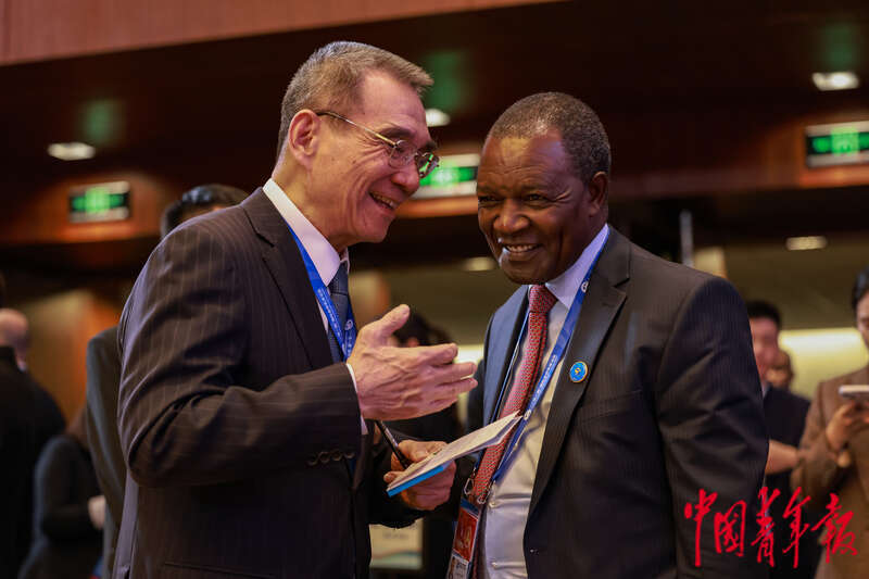 10月18日,北京国家会议中心,第三届“一带一路”国际合作高峰论坛贸易畅通专题论坛开始前,世界银行原副行长、北京大学新结构经济学研究院院长林毅夫(左)与肯尼亚财政和规划部部长恩朱古纳·恩东乌交流。当日,商务部会同海关总署、国家税务总局、中国进出口银行和中国出口信用保险公司,共同举办第三届“一带一路”国际合作高峰论坛贸易畅通专题论坛。论坛邀请了数十位共建国家政府官员、国际组织负责人、专家学者和100多位工商界代表,聚焦推进高水平贸易畅通,共同探讨深化多双边经贸合作、提升贸易投资自由化便利化水平等话题。中青报·中青网记者 曲俊燕/摄