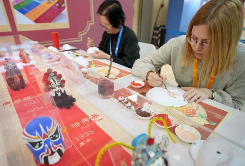 高峰论坛新闻中心科技文化互动展示区内,手绘彩塑京剧脸谱、木版水印、景泰蓝制作等中国“非遗”项目令众多外籍记者着迷;大型立体书页形状展板上,帆船、骆驼、中欧班列等具有象征意义的多元文化图案引人注目。