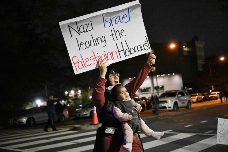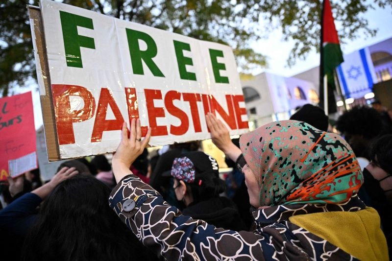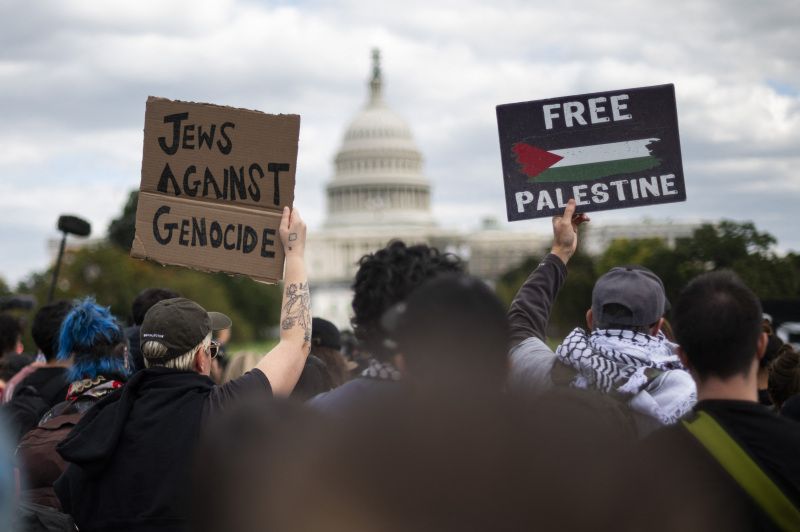 当地时间2023年10月18日,美国首都华盛顿哥伦比亚特区,大批示威者步行至国会大厦,展开游行活动,声援巴勒斯坦并呼吁巴以停火。