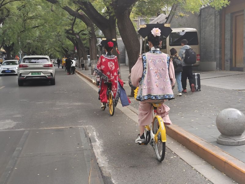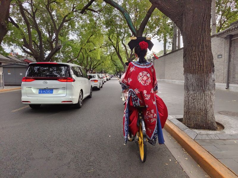 2023年10月18日,北京,故宫附近现“公主格格”骑共享单车。