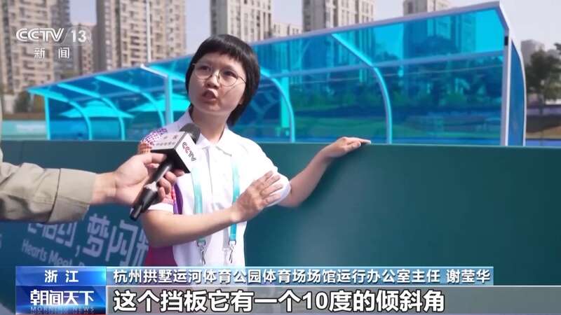 杭州拱墅运河体育公园体育场场馆运行办公室主任 谢莹华:这个挡板,它有一个10度的倾斜角。第二个我们的挡板选用了亚克力材质,可以对运动员起到很好的保护作用。