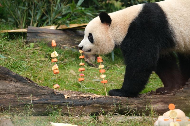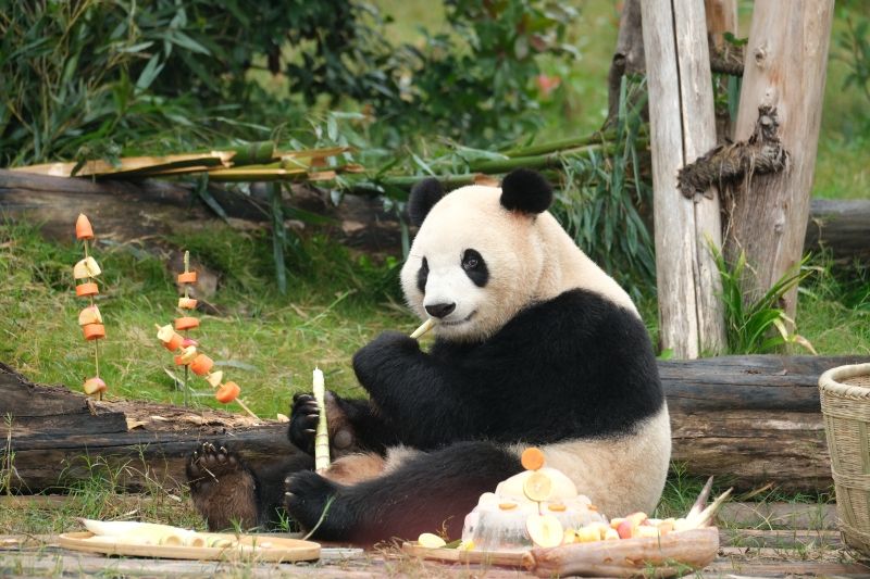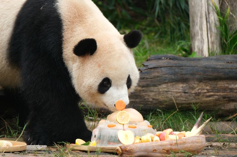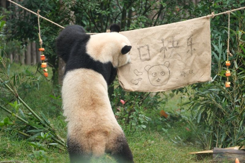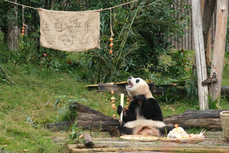 2023年10月18日,成都大熊猫繁育研究基地,大熊猫“福双”享受饲养员为它精心准备的生日宴。