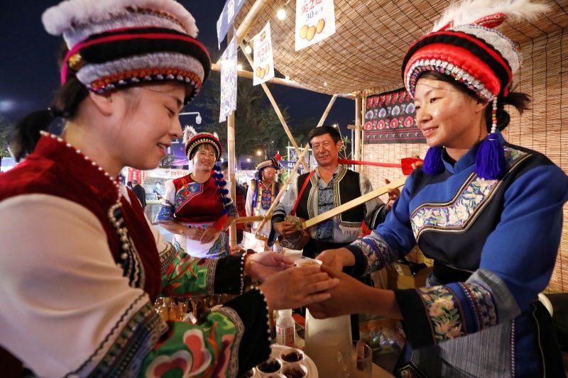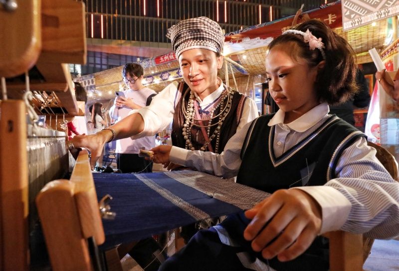 2023年10月19日,苏州,市民和游客在江苏省张家港市城南文体中心“守望长江”民俗文化市集上游玩,体验民俗文化。当晚,“守望长江”民俗文化市集开市。民俗文化市集通过“风情人文、琳琅好物、民俗表演、游艺体验”四大板块呈现,以长江流域13省(区、市)的特色文化为脉络,通过沉浸式体验民俗文化,打造一个兼具“市集、购物、体验、观演”的多元化空间,让市民和游客能近距离了解长江流域各地文化。活动将持续至10月22日。