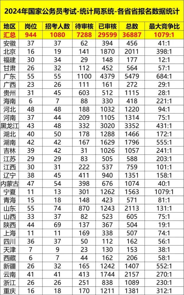从统计局系统竞争最激烈的十个岗位来看,目前“国家统计局宁夏调查总队”的“宁夏调查总队业务处室一级主任科员及以下(3)”职位竞争最为激烈,仅招录1人的情况下,有1280人报名,还有201个未审核,竞争比破千,高达1079:1,可见竞争的激烈程度。华图教育指出,还有想报考该岗位的同学一定要考虑清楚,谨慎选择。