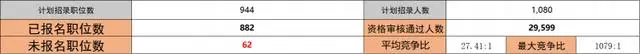 截至19日10时00分,统计局系统资格审核通过人数高达29599人,目前已经报名的职位有882个,占总招录职位的93.4%,还有62个职位未被报名。
