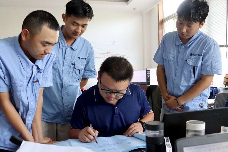 李永贵(左三)带年轻人讨论图纸。
