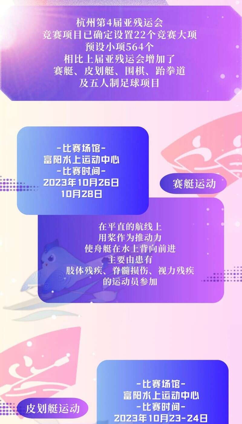 杭州第4届亚残运会竞赛项目已确定设置22个竞赛大项,预设小项564个,相比上届亚残运会增加了赛艇、皮划艇、围棋、跆拳道及五人制足球项目,下面为大家一一介绍。