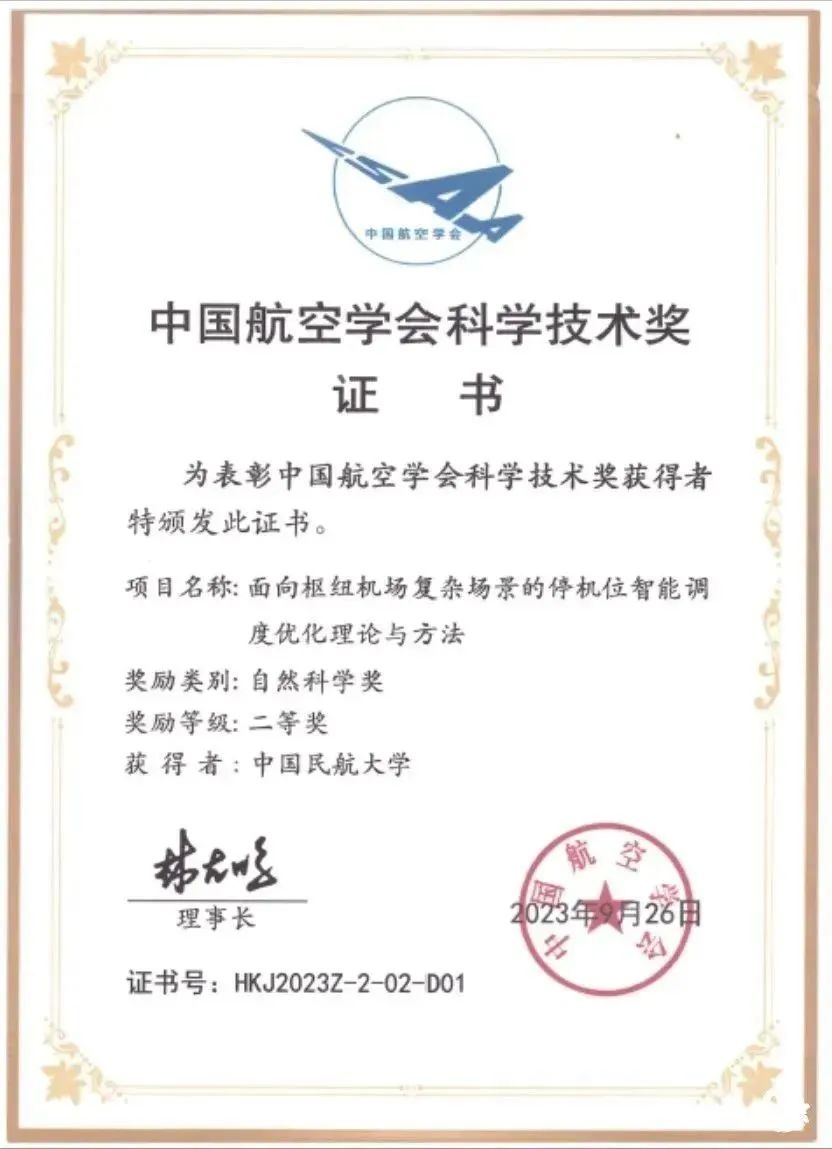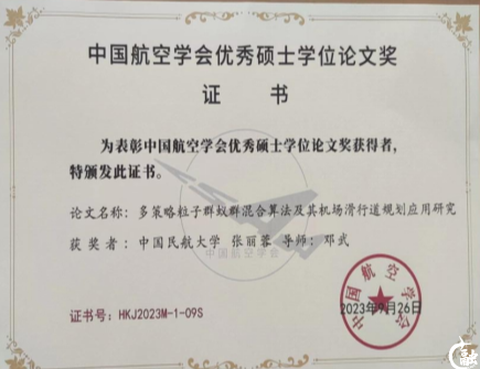 中国民航大学教授邓武的科研团队完成的科技研究成果《面向枢纽机场复杂场景的停机位智能调度优化理论与方法》荣获2023中国航空学会科学技术奖自然科学二等奖。邓武指导硕士研究生张丽蓉,所著论文《多策略粒子群蚁群混合算法及其机场滑行道规划应用研究》荣获中国航空学会优秀硕士学位论文奖。