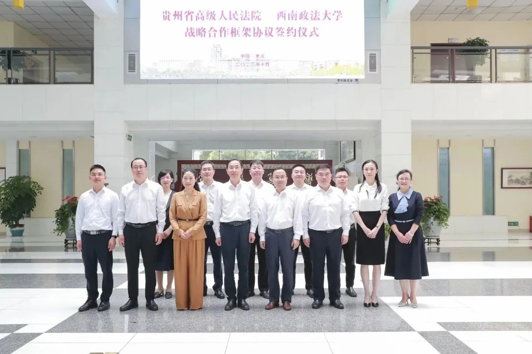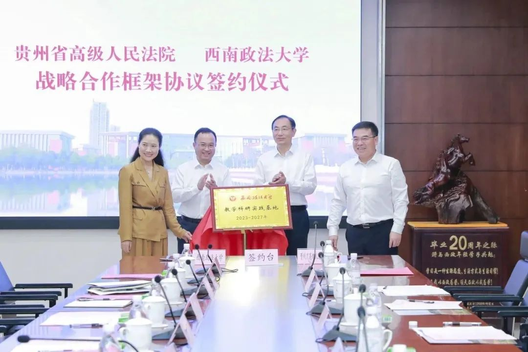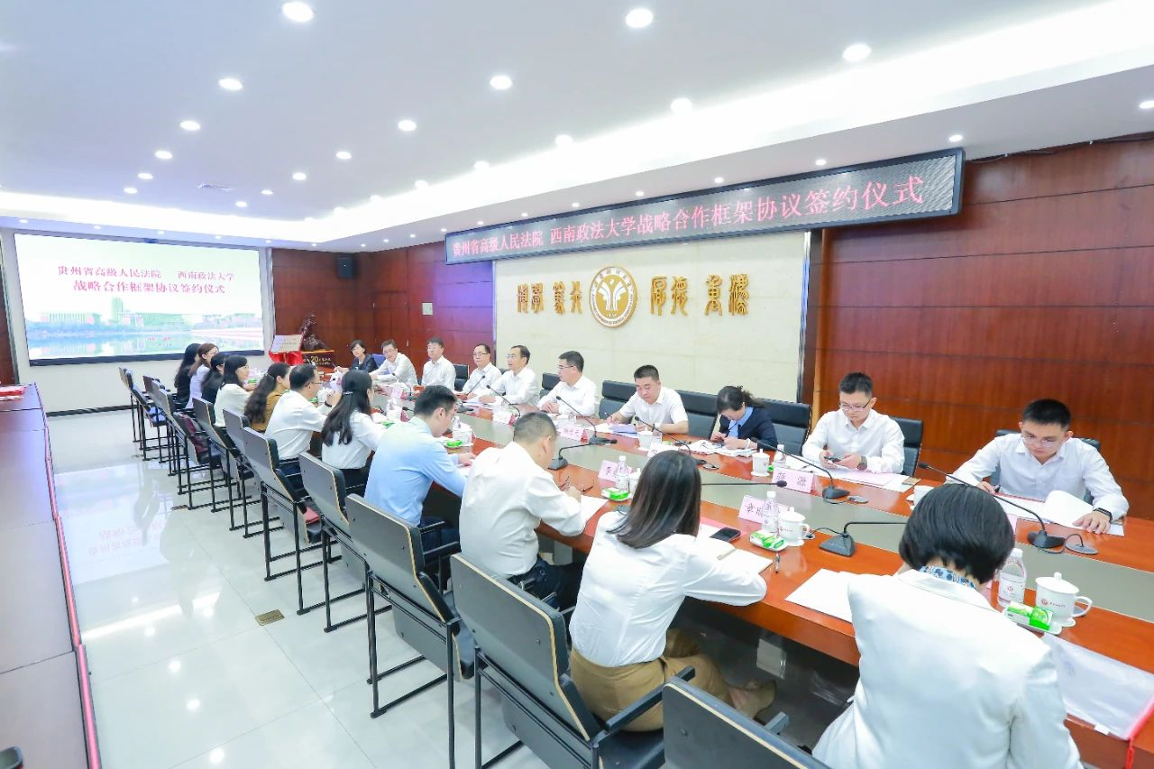 签约仪式上,贵州省高院党组成员、政治部主任李江波,西南政法大学党委常委、副校长刘革分别代表双方签署战略合作协议。