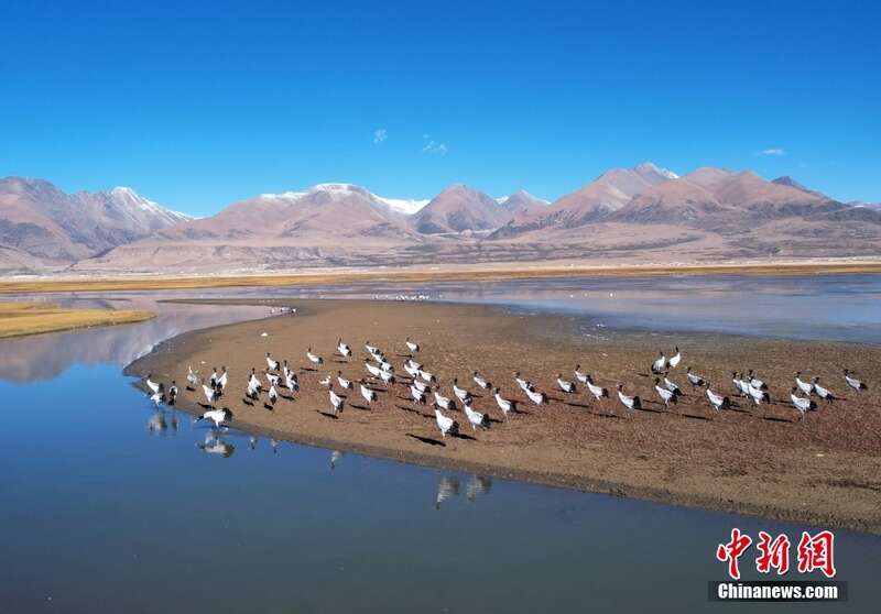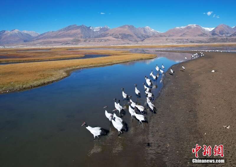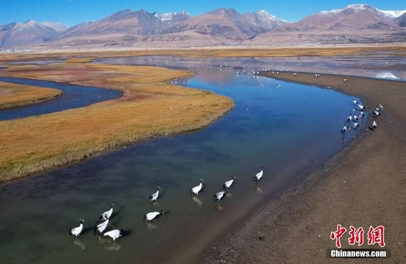 10月23日,成群的黑颈鹤在拉萨市当雄县阿热湿地内觅食。黑颈鹤是全球十五种鹤类中,唯一在高原地区繁殖和越冬的鹤类,属中国国家一级保护野生动物。中新社记者 李林 摄