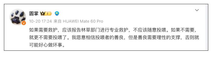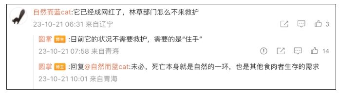 他还在回复中表示,死亡本身就是自然的一环,也是其他食肉者生存的需求……目前这只狼的状况不需要救护,需要的是“住手”。
