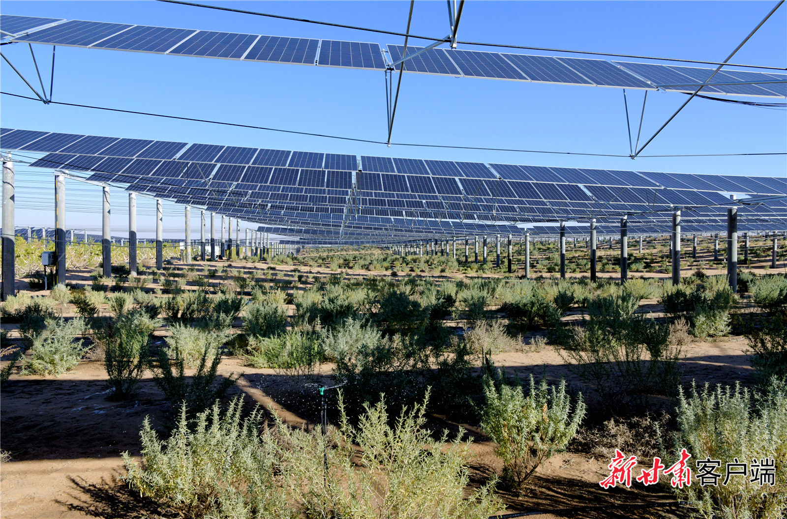 光伏板下,成片的草方格如同一张绿网,牢牢锁住流沙。草方格中间,花棒、沙打旺、沙米、四翅滨藜等沙生植物迎风挺拔。
