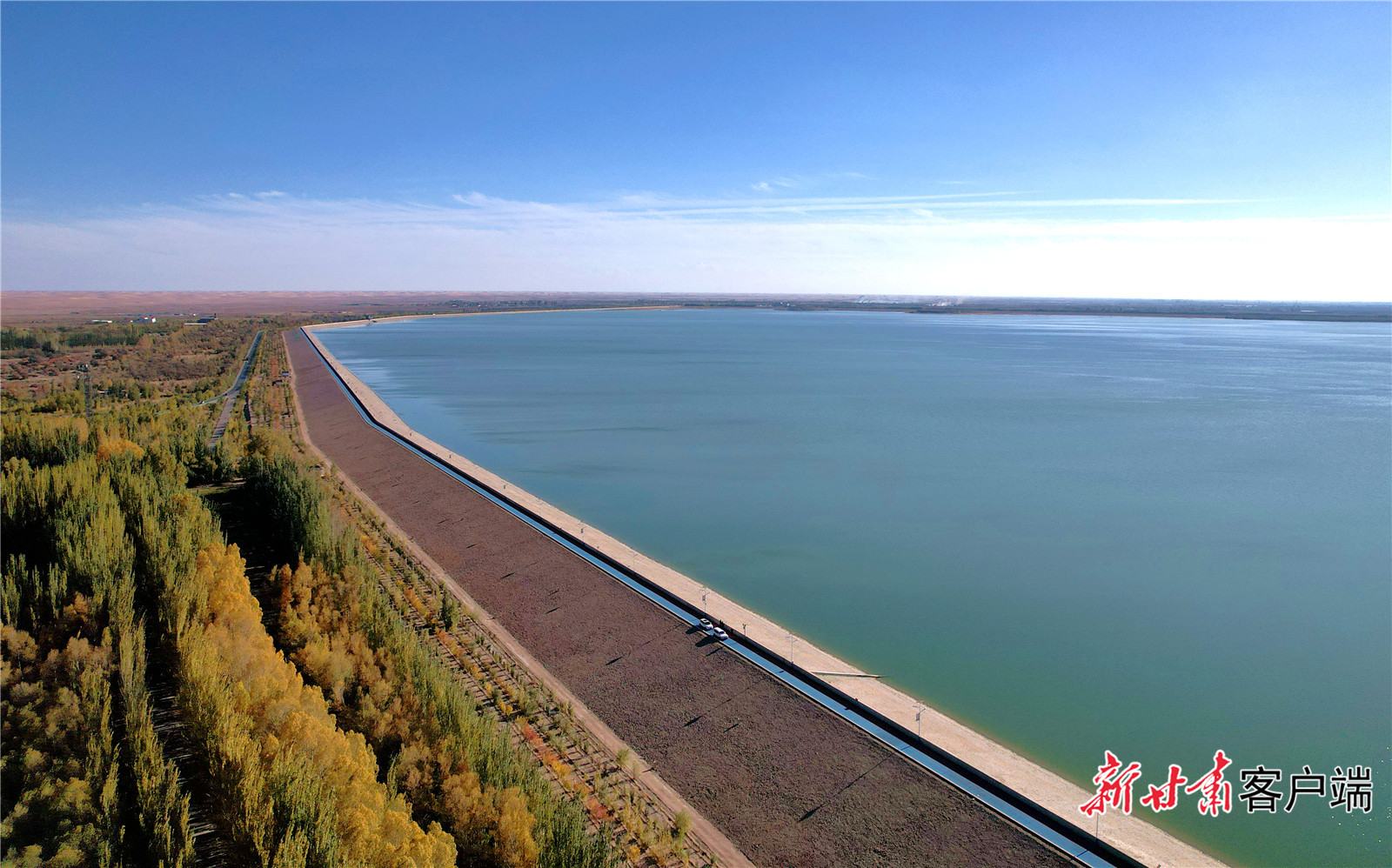 深秋的红崖山水库,碧波荡漾,大天鹅、白鹭等水鸟在水中游弋觅食,在水面追逐嬉戏,展翅翱翔。一望无垠的湖面,如同一面绿色宝镜镶嵌在民勤绿洲边缘。