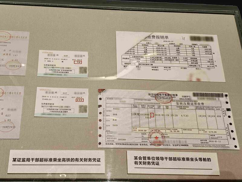 “远离迷途路”展区,两侧墙壁展示证监会系统近年来查处的违反中央八项规定精神和六大纪律的70多个典型案件,如与监管对象“交往越界”、违规投资股权、作风散漫、铺张浪费等。