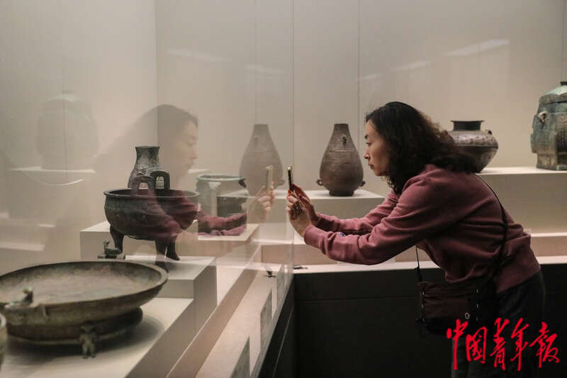 10月24日,清华大学艺术博物馆,“礼运东方:山东古代文明精粹”特展上,一名参观者在拍摄展出的青铜器。中青报·中青网记者 孔斯琪/摄